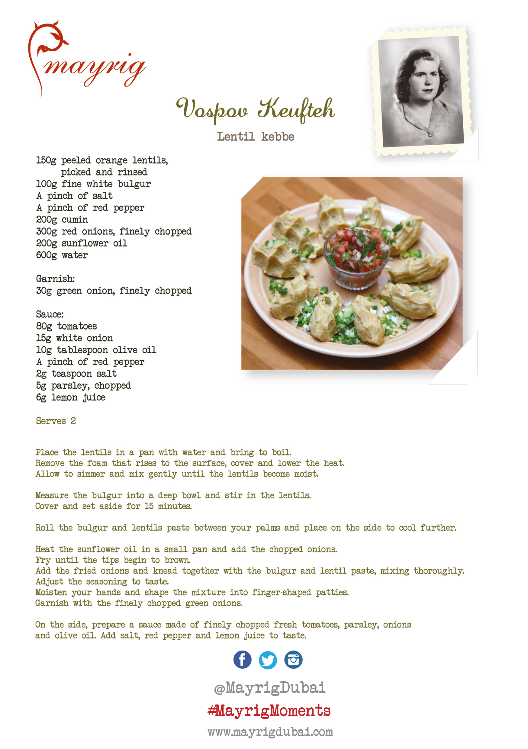 We are back with yet another delicious Armenian dish from Mayrig, the Vaspov Keufteh, or Lentil Kebbe.