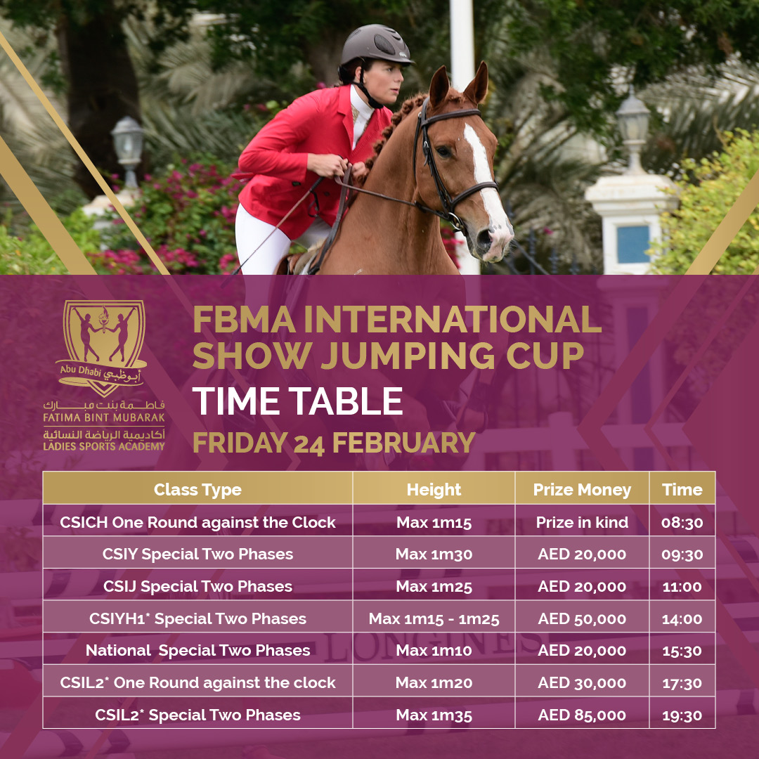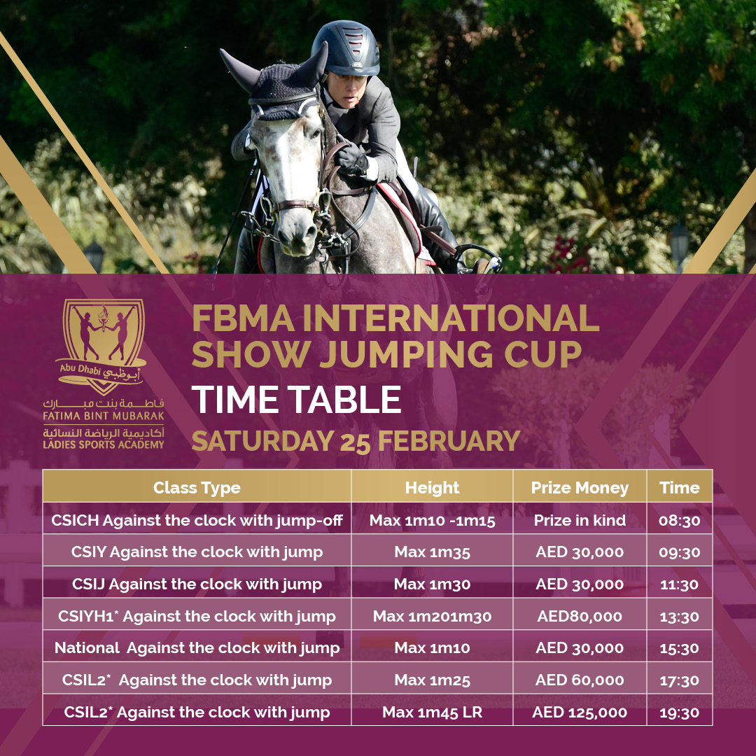 The Fatima Bint Mubarak International Show Jumping Cup is back for its fourth edition since its launch in 2013. This year’s competition, which will take place at the Abu Dhabi Equestrian Club on Friday 24 and Saturday 25 February, is expected to attract over 120 riders from across the world.